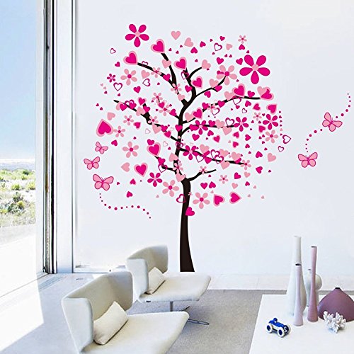 LiveGallery Removable Huge Pink Cartoon Heart Flower Tree Wall Decals Red Butterfly Wall Stickers Home art Decor for Kids Girls Babys Bedroom Nursery room Living Room Decorations