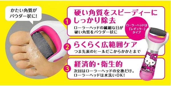 【使用方法】 (1)ローラーヘッド(ヤスリ部分。以下ヘッドと記載)を保護している透明カバーを外します。 (2)ヘッドが本体にしっかりセットされている事を確認してください。 ※ヘッドが付属されていない状態では使用しないでください。 (3)本体グリップ上部の銀色のリング部分を左に回し、スイッチを入れます。回転したヘッドをなでるようにやさしく気になる部位にあて、かたい角質を除去します。 ※乾燥した肌にお使いください。また強く押し付けすぎると、ローラーの回転が停止することがあります。 (4)肌がお望みのやわらかさ・なめらかさになったらケア完了です。実感いただけない時は再度行ってください。銀色のリング部分を右に回し、スイッチをオフにしてください。 (5)余分な角質をふき取り(もしくは洗い流し)、なめらかな仕上がりを実感してください。