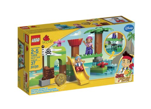 -. Feature : Features slide, flagpole and flag, rotating lookout tower, palm tree, assorted rounded and transparent DUPLO bricks, flowers and standard bricks / Accessories include a gold doubloon and Tiki and flag-decorated bricks / Take a ride down the slide Keep the gold doubloon safe from the Never Land pirates / Easy-to-build DUPLO products are specially designed to be fun and safe for younger hands / Measures over 5" high, 5" wide and 3" long