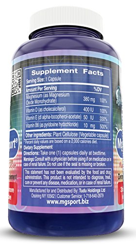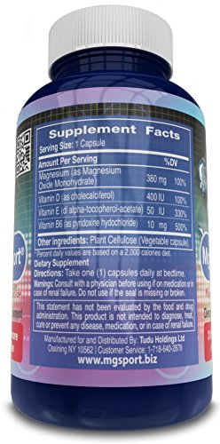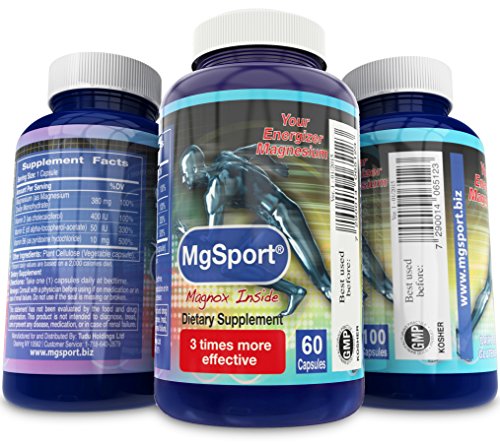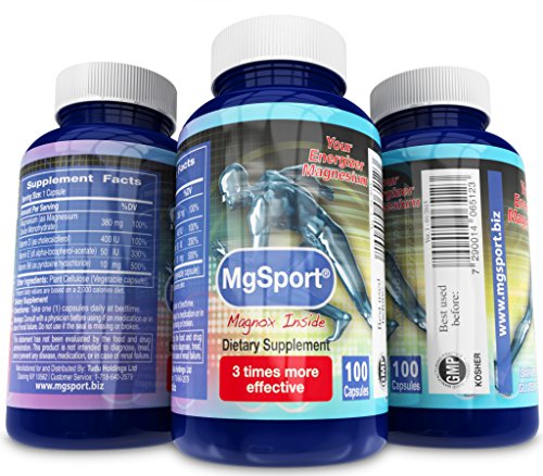 -. Binding : Health and Beauty -. Brand : MGM -. Department : Health & Personal care -. Feature : CLINICALLY TESTED - MgSport is the only magnesium supplement which is backed by a clinical study. The study shows MgSport is absorbed three times more than magnesium citrate in the cellular level. / ENHANCED WITH VITAMINS - MgSport is the only magnesium supplement with Vitamin B6, Vitamin E and Vitamin D for better absorption. / 380MG PER CAPSULE - Each capsule of MgSport contains 380mg elemental magnesium. One of the highest concentrations available. Beware of cheaper brands which show quantities per serving. / PURE FORMULA - MgSport comes in a veggie capsule. It's gluten and diary free. It is not buffered, easy to swallow, contains no artificial colours, no stearates and definitely not propylene glycol. MgSport has higher proven absorption than magnesium oxide, magnesium malate, magnesium taurate, chelated magnesium, magnesium glycinate, magnesium oxide and magnesium orotate. / THE MAGNESIUM MIRACLE - Magnesium is the miracle mineral! It assists in leg cramps, heart palpitation, energy production, bowel motions, sleep, bone formation, relaxation, positive mood, diabetes, blood pressure, migraines and many other processes in the body! MgSport is an excellent magnesium for women and men. This supplement supports calcium absorption. -. Label : Magnox Sport -. Manufacturer : Magnox Sport -. ProductGroup : Health and Beauty -. ProductTypeName : HEALTH_PERSONAL_CARE -. Publisher : Magnox Sport -. Studio : Magnox Sport -. Title : MgSport Magnesium - Highest Intracellular Absorption - Clinically Tested, Bioavailable, 380mg Elemental Magnesium Per Capule, 100 Count - Not Buffered, No Artificial Colors, No Sterates, Gluten Free - with Vitamin B6, Vitamin D and Vitamin E - 180 Day Money Back Guarantee