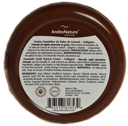 -. Feature : Anti-Ageing - Softens Skin - Made In Chile - Contains Elastina - Deep Moisturiser - Non-Oily Formula / Contains Collagen - Fast FREE US Delivery - 100% Paraben Free - Not Tested On Animals / Rapid Absorption Formula - Attenuates Expression Lines - Large 150g (5.1oz) Sealed Pot / 100% Natural Organic Ingredients - Suitable For Normal, Dry & Oily Skin - pH: 5.6 / Contains Proteic Helix Aspersa 'Chilean Land Snail' Secretion - For; Anti-Ageing, Acne, Blemishes, Scars, Burns, Scars, Spots & Stretch-Marks