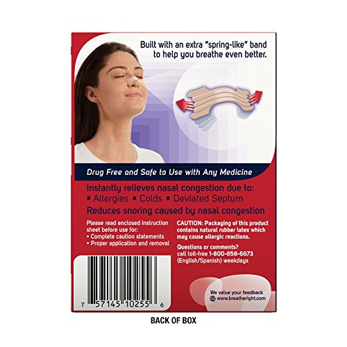 -. Binding : Health and Beauty -. Brand : Breathe Right -. EAN : 0757145102556 -. Feature : Breathe Right nasal strips open your nose up to 38% more than allergy decongestant sprays alone and can help you reduce or even stop nasal snoring / Contain an extra "sP.R.Ing-like" band and are designed to be 50% stronger than Breathe Right Original Nasal Strips / Provide relief for nighttime nasal congestion due to cold or allergies / Flexible, sP.R.Ing-like bands lift and open nasal passages to help you breathe better and sleep better at night / Alleviate stuffy nose to help you stop nasal snoring at night / Drug-free -. Label : GlaxoSmithKline -. Manufacturer : GlaxoSmithKline -. PackageQuantity : 1 -. ProductGroup : Pantry -. ProductTypeName : HEALTH_PERSONAL_CARE -. Publisher : GlaxoSmithKline -. Studio : GlaxoSmithKline -. Title : Breathe Right Nasal Strips, Extra, 26 Count -. UPC : 757145102556