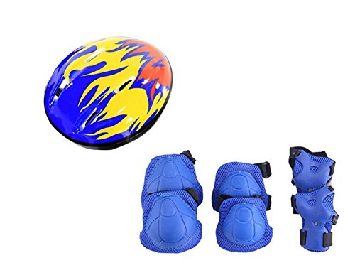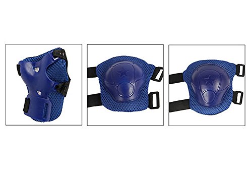 -. Feature : S suitable for 3-6 year old children;M suitable for 7-12 year old children. / Multiple adjustable elastic straps and Velcro closures for secure fit for various knee girths / Made of durable, soft EVA padded material with plastic plates, comfortable and protective / Each order including 1 helmets, 1 pair kneepad, 1 pair elbow-pad , 1 pair wrister.