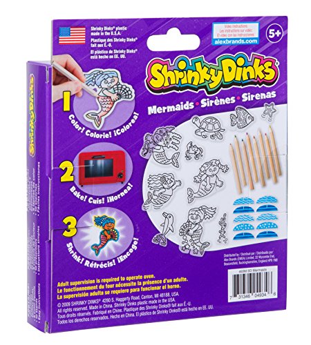 Shrinky Dinks Minis Mermaids is a pleasant way to spend a day indoors! Color, bake and shrink mermaid and sea creature figurines. Connect their pieces to their stands and make up exciting adventures for them. Shrinky Dinks sheets are made of a special thin, flexible plastic which, when heated in an oven, shrink and harden without altering their color or shape. We precut all the fun shapes in every one of our kits to make them easy to work with! Includes 10 preprinted and precut Shrinky Dinks, 8 colored pencils, 10 stands and easy instructions. Recommended for children 5 years of age and older.Feature