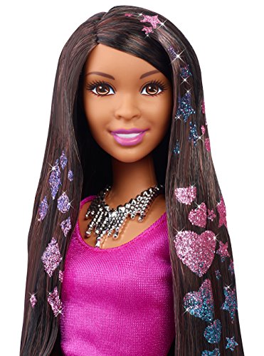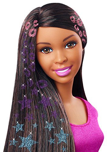 Glam, trendy and fun, young stylists can create glittery looks for Nikki doll using this glamorous glitter hairstyling set -- unique adhesive design sheets and glitter sheets allow your creative expression to sparkle. Separate a small section of Nikki doll’s hair and clip it into the hair tool -- or work freehand for a totally unique look. Select an adhesive design, and press it on to the hair. Then choose a glitter sheet. Press it on to the adhesive design and wipe the glitter sheet downward to transfer the sparkle onto Nikki doll’s hair! It’s so easy! Then style even more with the included barrettes and hair elastics to create a look to love. Nikki doll will look gorgeous in her trendy outfit with a fabulous necklace and cute pair of heels that complete the look. Try out different colors, styles and combinations to suit the story or style! Express a mood or a moment! Set includes Nikki doll dressed in fashion and accessories, hair tool, seven glitter sheets, 16 adhesive sheets, two barrettes, three hair elastics and one hair comb. Doll cannot stand alone. Colors and decorations may vary.Feature