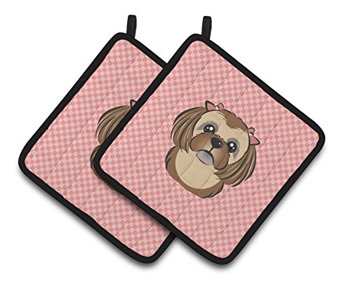 Caroline's Treasures Checkerboard Pink Chocolate Brown Shih Tzu Pair of Pot Holders BB1249PTHD, 7.5HX7.5W, Multicolor