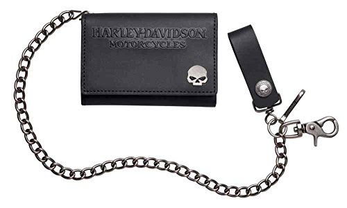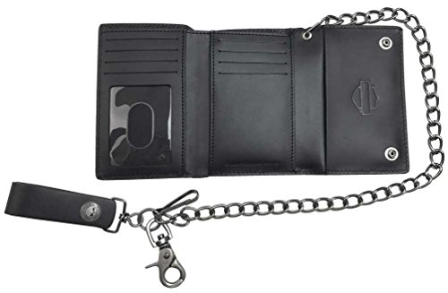 Studio : Harley-Davidson Publisher : Harley-Davidson Binding : Apparel Product Description Harley-Davidson® Men's Tri-Fold Biker Wallet, 99444-16VM. Genuine leather. Snap closure. Seven credit card slots, ID window, Three interior pockets, and one currency pockets hold most paper currencies. Heavy-duty 19" wallet chain with snap leather belt loop, snap hook, and key clip. Debossed graphics and metal badge on front. Embossed graphics on interior pocket. Measures 5.5" x 3.75". 99444-16VM 0