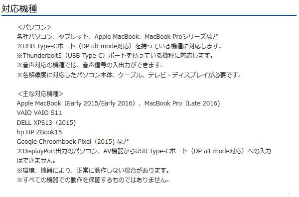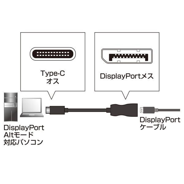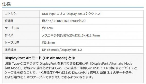 映像出力可能なUSB Type-Cポートを搭載したパソコン本体をDisplayPort入力端子を持つディスプレイ・テレビに接続するときに使用する変換アダプタケーブルです。「Displayport Alternate Mode(ディスプレイポート オルタネートモード)」に準拠しているUSB Type-Cポートに接続し、DisplayPortの映像信号に変換できます。 |