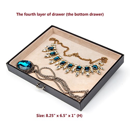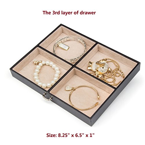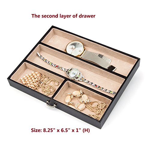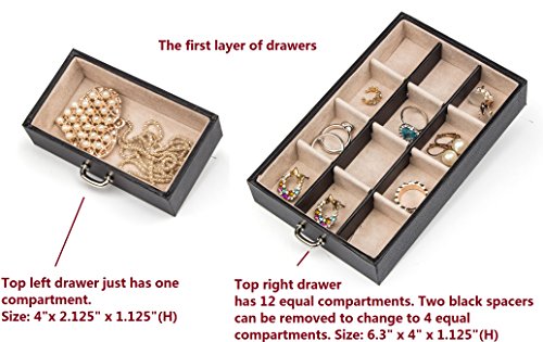 -. Binding : Jewelry -. Brand : Kendal -. EAN : 0783583120166 -. Feature : 5 slide out drawers; 20 compartments;10 necklace hooks;3 large storage pouches;Lined in silsuede and finished in oiled leather and durable synthahide; / 2 removable earring holders which hold up to 30 earrings (10 hanging, 20 posts) / Twin fold out side compartments with snap closures. Great for hanging necklaces, bracelets, and other; / Lock with a key ;Large mirror on top lid;removable mini travel jewelry box (shown at rear left of the jewelry box) that holds even more rings/necklaces/earrings and other jewelry.. perfect for any trip! / Measures 10.50 inch (L) x 7.38 inch (W) x 8.38 inch (H) when closed. -. IsAutographed : 0 -. Label : Shining Image -. Manufacturer : Shining Image -. PackageQuantity : 120 -. ProductGroup : Home -. ProductTypeName : FASHIONOTHER -. Publisher : Shining Image -. Studio : Shining Image -. Title : Black Leather Jewelry Box Travel Case and Lock -. UPC : 783583120166