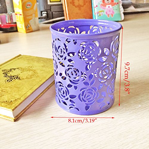 Yueton Hollow Rose Flower Pattern Metal Pen Pencil Pot Cup Holder Desk Container Organizer (Light Purple)
