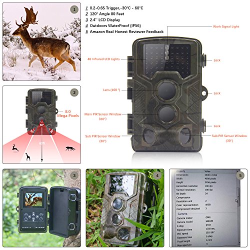 [Short Trigger Speed & Long Trigger Distance]:Fast trigger time of 0.2 with 46 Leds IR emitters an 80 feet flash range 120°detection angle, Programmable trigger interval and up to 5 pictures Multi-Shot feature.