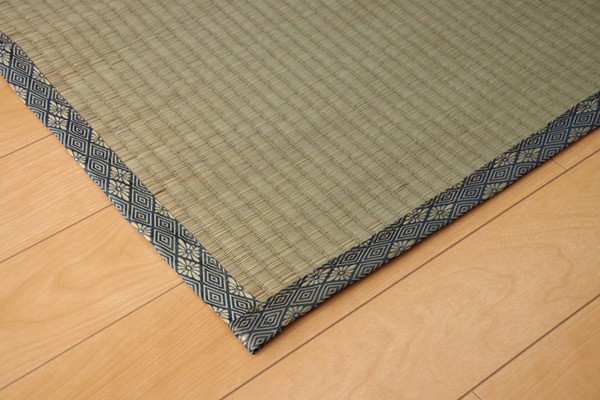 上敷きを敷くだけで畳のお部屋をリフレッシュ出来ます。日焼けしてしまった畳のリフレッシュに、新品の畳を汚さないためのカバーにご使用下さい。長さ110~115cm程の国産(九州産)い草を使用しています。そのうち約92cmを使用しています。ヘリ際は強く白みを帯びます。(日焼けではありません、い草の根元と先端部分の色です。)い草は長いものほど高級になります。い草は先端部分が赤茶色く、根元が白く真中が青(緑)色です。真中の良質な青の部分を多く使用するほど、丈夫で綺麗な仕上がりとなります。またイ草は使用するうちに日焼けをしますが、真中の青の部分を多く使用したものほど、全体が綺麗にムラなく日焼けし、味が出ます。こちらの商品は畳表と同じ織り方の糸引織で仕上げました。双目織りと比べて、い草の打ち込み本数が多いため丈夫です。表面が滑らかなので、ホコリなどがたまりにくいのが特徴です。長くご使用されたい方や、耐久性をお求めの方には糸引織をおすすめします。国産(九州産)のい草を使用しています。国産い草は一本一本が太く、表皮が厚く繊維がキメ細かいので弾力性があり、耐久性に優れています。い草には空気の清浄化作用、湿度の調節作用があり、汚れにくいといった特徴があります。い草に青森ヒバ加工を施しています。(抗菌、防臭効果)表裏の両面が使えて経済的です。