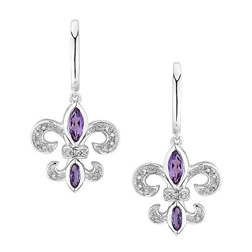 These sterling silver Fleur-de-lis earrings each feature 2 marquise shaped genuine amethyst and 13 round accent diamonds. Earrings are 33mm long. Diamonds are 0.07ctw, I or better in color and I3 or better in clarity.Feature