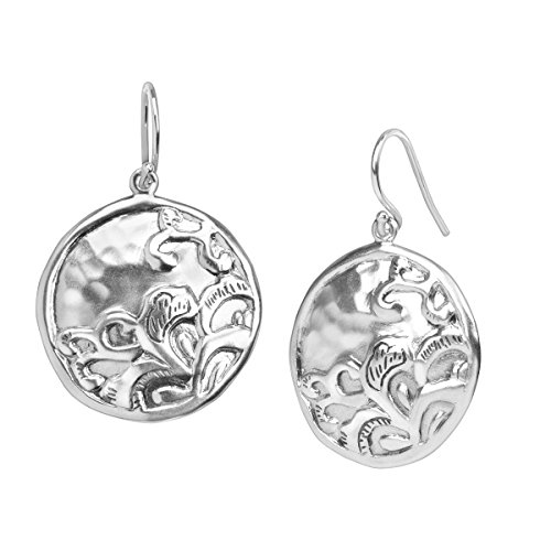 These Tidal Wave earrings feature a circular pendant in sterling silver which boasts sterling silver vines on half of the face and a raised edge on the rim. Earrings measure 1 1/2 by 1 inches, finished with French-wire back-findings. Piece comes with a ".925" sterling silver stamp as a symbol of guaranteed product quality.
