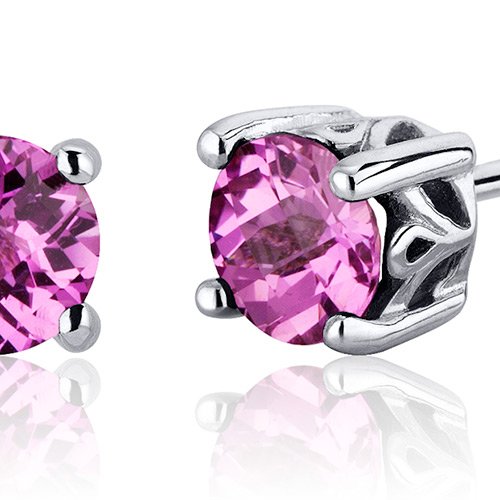 Center Stone: 2 Pieces Lab Created Pink Sapphire, Round Cut with Checker Board Top 6 mm Diameter, 2.00 carats total weight, Powder Pink Hue with Brilliant Sparkle. Earrings: 2.50 grams, Pure Sterling Silver Rhodium Finish with .925 stamp, Earrings feature Stud posts with Bullet backs, exceptional Design, Craftsmanship and Rhodium Finishing. Perfect gift for Mothers Day, Birthdays, Valentines Day, Graduation, Christmas or just about any other occasion. Money Back Guarantee. Includes a Signature Gift Box & style SE7956Feature