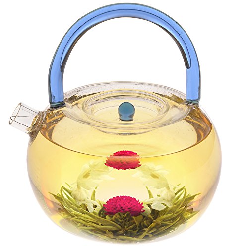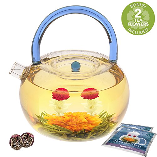 Tea Blooms Blossom Before Your Eyes This 40 ounce borosilicate glass teapot will give you years of reliable service - and remain looking as beautiful as it does on its first day in your home. The extra thick glass resists scratching and will never cloud or shatter due to extreme changes in temperature. A Gourmet Gift for Your Favorite Tea Lover Every pot of tea is filled with liquid happiness. Especially when relishing a pot of Teabloom's very special hand-tied flowering tea balls. Simply place a flowering tea ball into a clear, heat-resistant borosilicate teapot and carefully cover with 3 to 4 inches of boiling water. This will ensure the flower has plenty of room to bloom properly. Wholesome Green Tea Grown at High Elevation The tea balls included with the Blue Rainbow Teapot are green tea with acai berry. They're produced by plants nurtured at higher altitudes where the leaves can take their sweet time maturing. This final result is a richer, deeper tasting tea. The least processed of all popular teas, green tea preserves all its health-giving nutrients. 100% Money Back Guarantee The Teabloom family wants you to shop with complete confidence knowing that we proudly provide our Blue Rainbow Teapot Kettle with a full satisfaction and money back guarantee. If you don't absolutely love your teapot, let us know and we'll refund your money with no questions asked. Order Your New Blue Rainbow Teapot Kettle Gift Set Today and Discover a Brighter Way to Brew Your Tea 0 |
