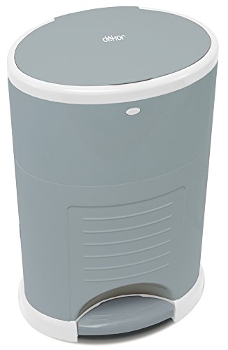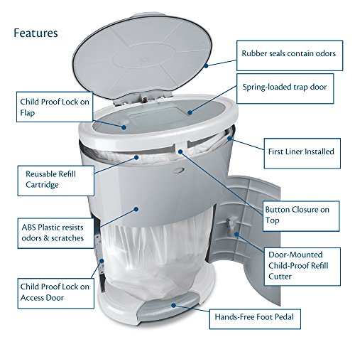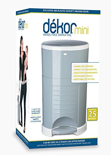 Who’s excited about changing diapers 6,000-9,000 times per child? Dekor Hands-Free Diaper Pails are designed to make this unpleasant chore as easy as possible for you AND your budget. Unlike other disposal systems where you have to bend over, operate a lid, or shove a soiled diaper halfway inside the pail; Dekor pails are 100% hands-free. After a diaper change, you are likely to have baby in one arm and the soiled diaper in the other. No one has a third hand to operate the diaper pail. Just STEP on our foot pedal AND DROP the soiled diaper through the trap door. No squishing, twisting or cramming. No other diaper pail on the market is as easy to use! A childproof lock keeps curious toddlers out. Continuous liners allow you to empty the pail whenever you want, using only as much refill as you need. Simply cut the refill with the kid-safe cutter located inside the access door, discard, and tie a new knot in the remaining bag. You don’t need to waste a full bag to empty a partially-full pail. There is an effective triple odor control that keeps smell in the pail. First, the spring-loaded trap door shuts immediately after the diaper passes through. Next, rubber gaskets on the trap door and the top lid tightly seal odors inside the pail. Finally, the refillable liner helps neutralize odors with a pleasing baby-powder scent. Because all our pails are made with closed-cell ABS plastic, they cannot absorb odors like cheaper plastics, will not dent, and are scratch- and fade-resistant. You’ll be able to use our product long after your little one is out of diapers. Simply pop out the diaper insert and use in the bathroom, kitchen, or garage. The Dekor Mini makes a great secondary pail, holding up to 25 newborn diapers; and is available in the following colors: White, Sage, and Gray.Feature