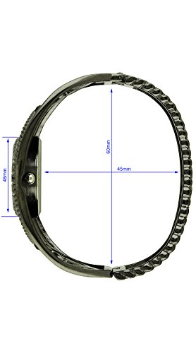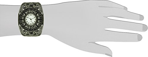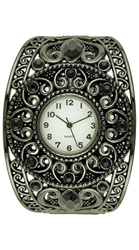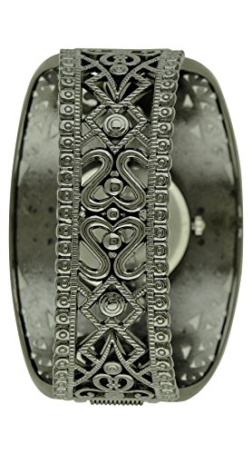 [Description] Fancy scrollwork design Easy fit bangle Fits wrists to 7.5 inches Rhinestones embedded in the setting Japan quartz movement made by Seiko Instruments Inc