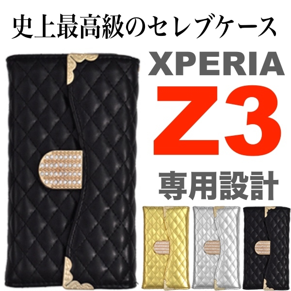 Xperia Z3(SOL26/SO-01G/401SO)用のゴージャスデコキルティングケースポーチ。