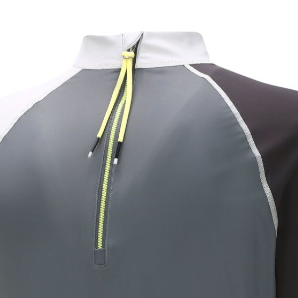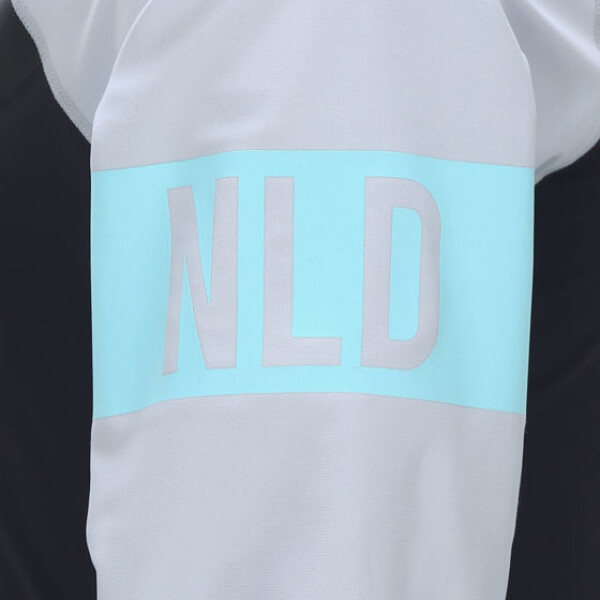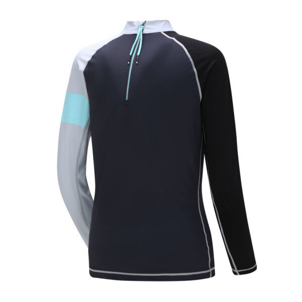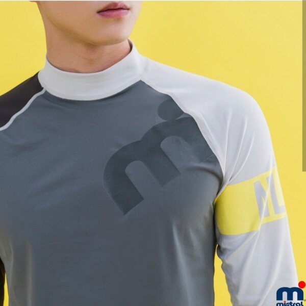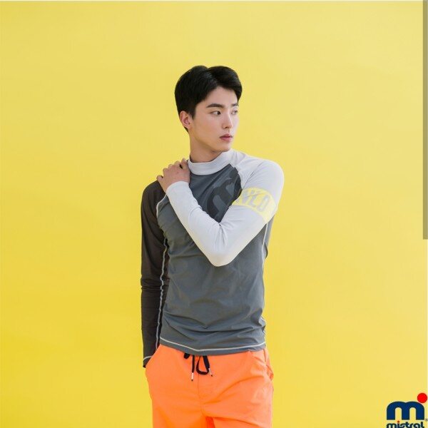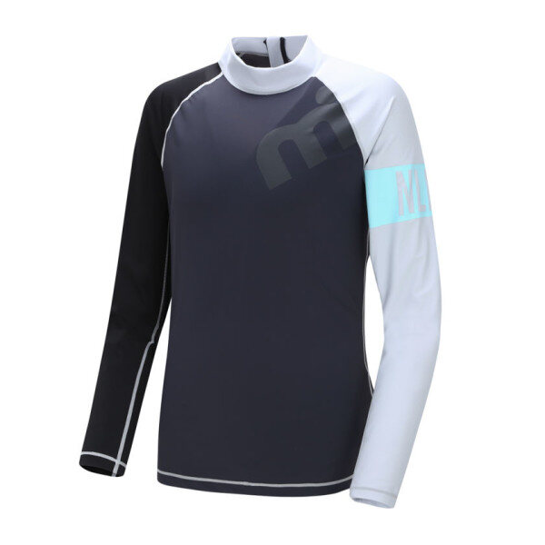 ?수트에서 모티브된 뒤쪽 지퍼 래쉬가드로 빅로고 엠닷을 몸판컬러와 톤온톤형태로 활용하여 부담없는 로고플레이 적용 .