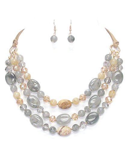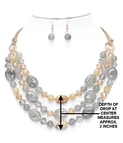 18 inch gray, smoky and tawny light beige glass, acrylic and marbled faux-stone bead three strand layered look necklace on faux-suede. An additional 3 inches of wearable length is available via extender chain.
