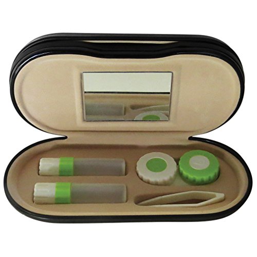 Mirror included in the case for changing contacts on the go. Measures approximately 6.25"L by 3"W by 2"H. Comes in Black. Two solution bottles are provided along with small tweezers to help prevent contamination of contact lens solution.