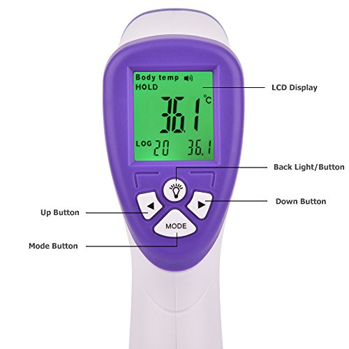 Product Key Features: Non contact: Safe and clean, 0.4-2.36 in (1-6 cm) measuring distance Large memories: Can store 32 memories for data analysis Buzzer can be closed or opened by Mute Button, easy to use Switchable between Celsius and Fahrenheit, body temperature and object temperature Large-size LCD screen, display clearly and with backlit Instant and Accurate Reading in 2 seconds Fever Alarm: The LCD Backlit will turn Red if fever detected (Above 100.4F(38°C))