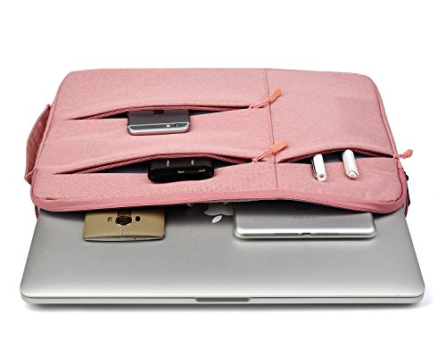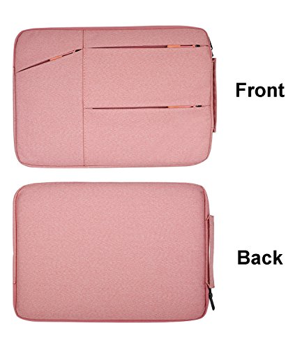 FRONT THREE POCKETS STORAGE & DURABLE ZIPPER - Three pockets in front, enough space to keeping, mouse, cable, cellphone, memory cards, external hard drive, pens etc. Top-loading zipper on the sleeve glides smoothly and allows convenient access to your laptop