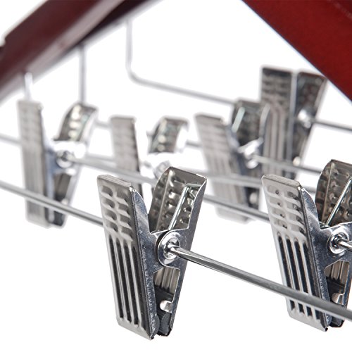 -. Feature : Sturdy wood construction - built to hold all shapes and styles of pants, shirts and coats / Anti-rust hook - 360 degree swivel hook, sturdy construction to fit all standard closet rods / Space-saving design - you can hang shirt and pants at once on one hanger, keep your closet organized / Durable and solid enough - made of Gugertree, natural wood grain, walnut finished / Protect your delicate clothes - two adjustable anti-rust clips with soft felt lining to safely grip even delicate garment