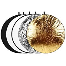 ▲ Fits any standard reflector holders, suitable to use indoor and outdoor ▲ Five Surfaces: Gold, Silver, White, Black and Translucent ▲ Diameter Size: 42.5 inches/108cm(open), 15.7 inches/40cm(collapsed) ▲ Package: 1 x 5 in 1 lighting reflector, 1 x bag, easy and lightweight to carry anywhere
