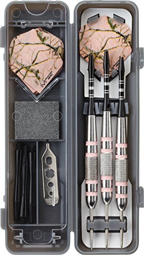 This Officially Licensed Fat Cat Realtree APC dart set is the ideal camouflaged dart set to eye up the perfect shot. Each steel tip dart weighs 23 grams. This set includes three center balanced nickel silver barrels with pink painted rings, three aluminum color master shafts with locking hole, three nylon shafts, six Poly Pro flights, one tip shaping stone, one dart mechanic wrench, and one slim case.