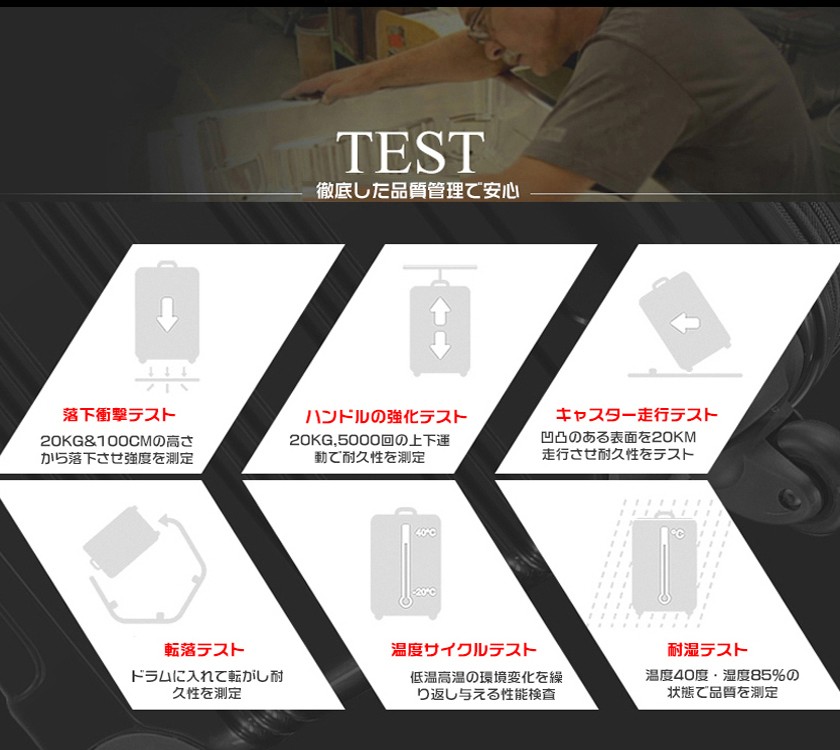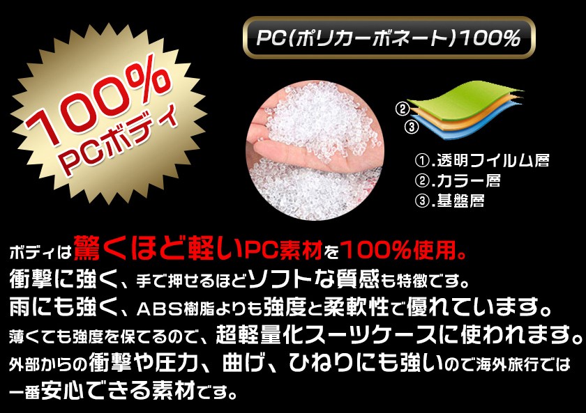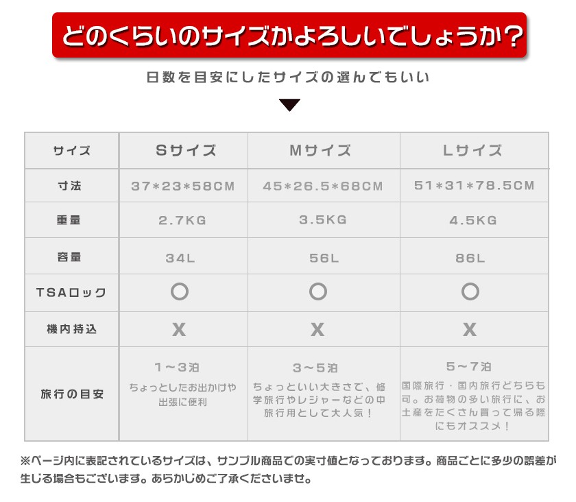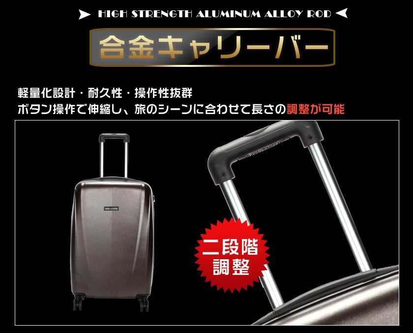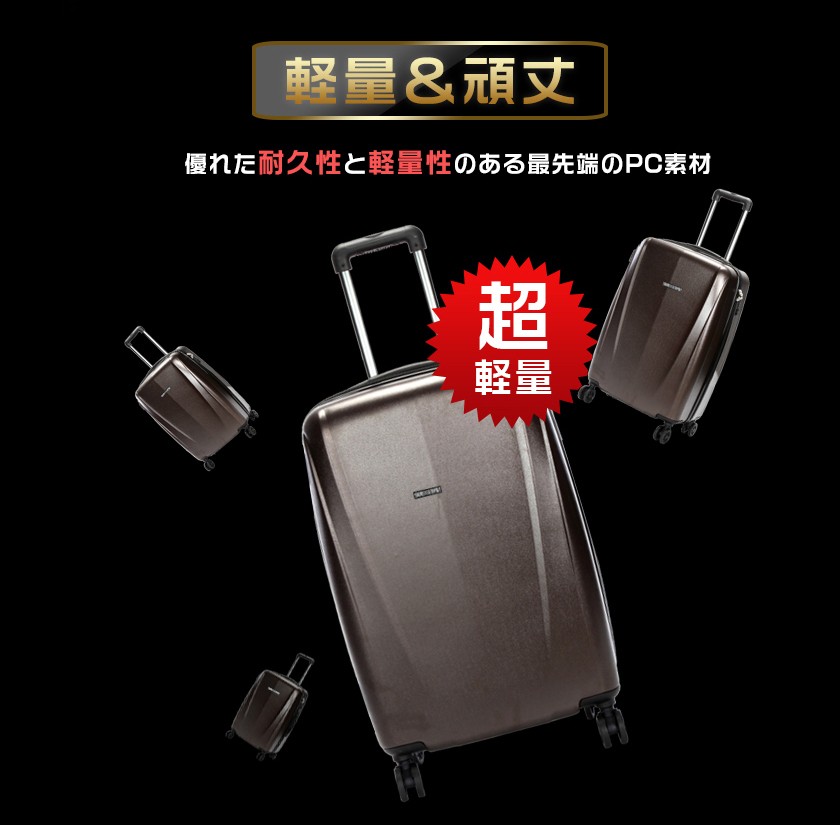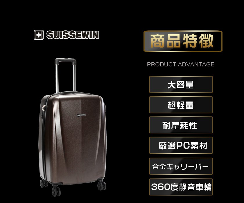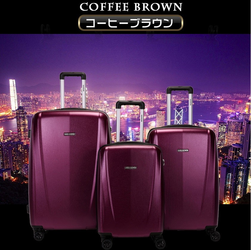 素材は軽くて耐久性に優れたABS樹脂+PC 100%(本体部分)キャスターは操作性のスムーズな360度回転 4輪独立サイレントキャスター段階調整キャリーハンドルTSAロック搭載のファスナーロック式。★商品名称:スーツケース★ブランド:SUISSEWIN★型番:SN6700★素材:表装:ABS+PC100%(本体部分)裏装:1680D ballistic nylon(バリスティック ナイロン)+Polyester(ポリエステル)★Sサイズ外寸:幅約37cm*奥行約23cm*高さ約58cm★Sサイズ重さ:約2.7KG★Sサイズ容量:34L★Mサイズ外寸:幅約45m*奥行約26.5cm*高さ約68cm★Mサイズ重さ:約3.5KG★Mサイズ容量:56L★Lサイズ外寸:幅約51cm*奥行約31cm*高さ約78.5cm★Lサイズ重さ:約4.5KG★Lサイズ容量:86L★TSAロック:搭載カラー:パープル、コーヒーブラウン※注意事項 S sizeのスーツケースは横側取っ手と底足が付いておりません。