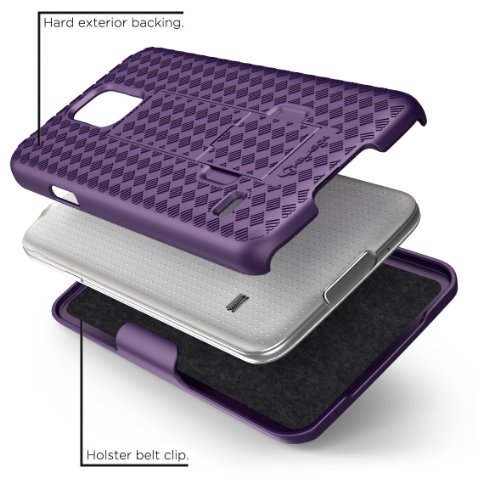 - Feature : Fully support new Galaxy S5 finger print scanner and heartbeat sensor funcations / Holster clip swivels and has sturdy locking mechanism to keep your phone in place / Shell holster and back cover Design with Kick Stand for Video Watching / Rubberized textured case adds protection and makes gripping your phone easy / Your phone can easily be removed from holster without removing it from the case