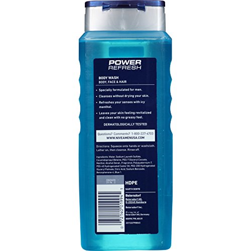 NIVEA Men Power Refresh body wash is specially designed for men who crave that extra burst of freshness. With icy menthol, it leaves skin feeling clean and refreshed without drying. A 3-in-1 body wash for Body, Hair & Face.Feature