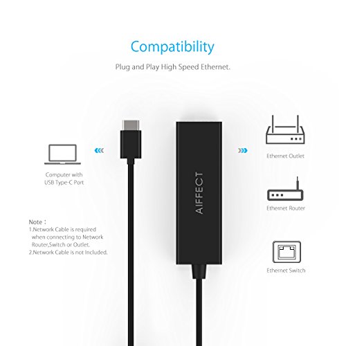 AIFFECT USB 3.1 Type C Ethernet Adapter USB C (Thunderbolt 3 Port Compatible) to RJ45 Gigabit LAN Network Aluminum Adapter for New MacBook 2016, ChromeBook Pixel and More - Black