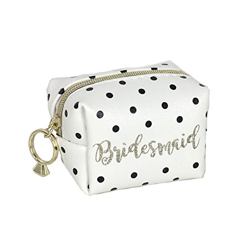 - Faux leather mini cosmetic case in polka dot print with glittering "Bridesmaid" text at front. Zip top closure & wedding ring zip pull.