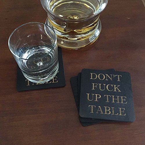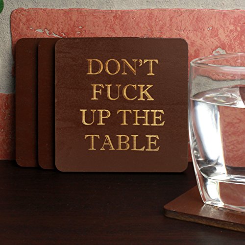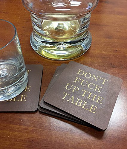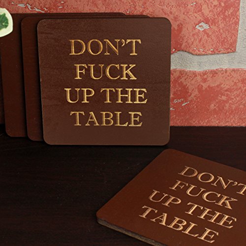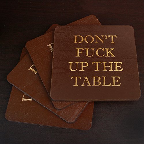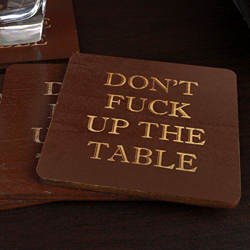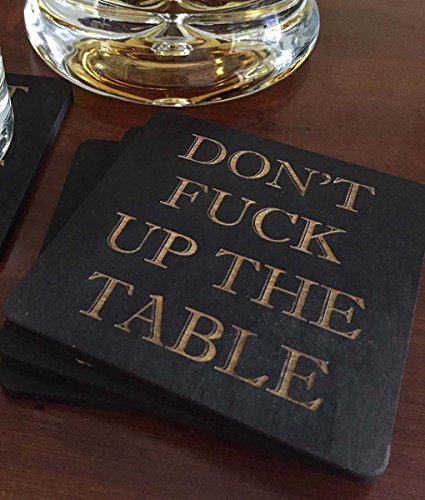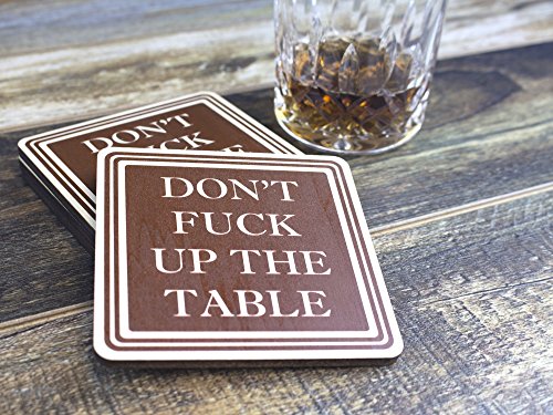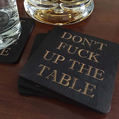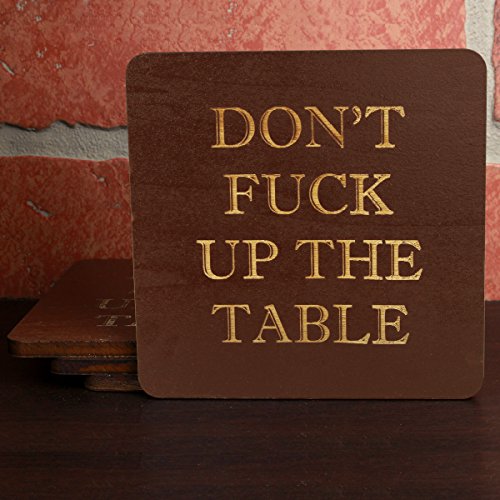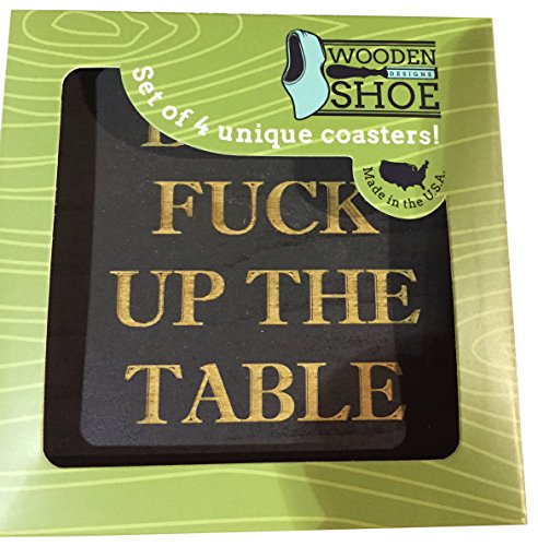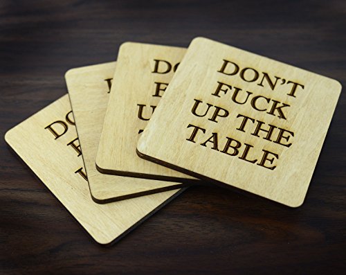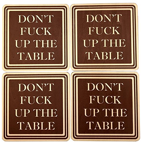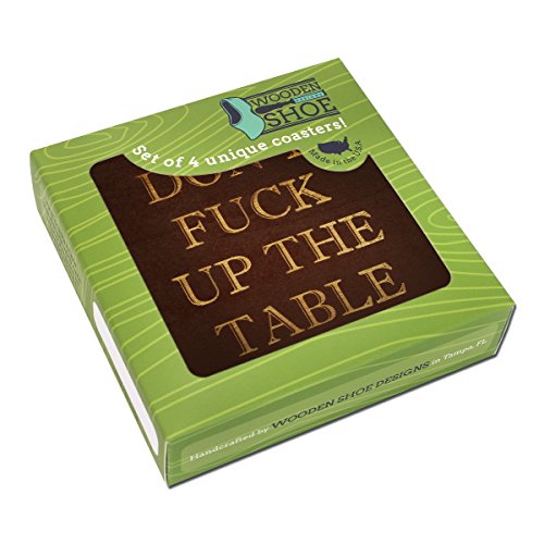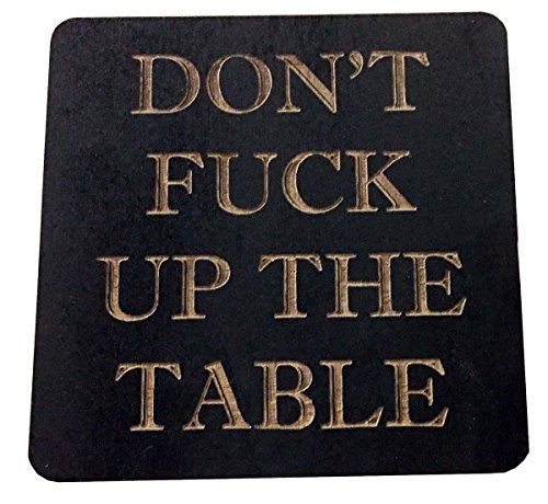Studio : Wooden Shoe Designs, LLC Publisher : Wooden Shoe Designs, LLC Product Description Whenever you hand somebody a coaster this is what you are really saying. "Don't Fuck Up The Table!" These witty and fun coasters are handmade out of baltic birch wood. Each piece is then hand stained and laser etched. They work great, make a fantastic conversation piece, and are just super fun and clever. Each coaster measures 4" x 4" and is 1/4" thick. Each order consists of 4 wood coasters. 0