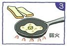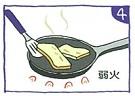 フライパンにバター(またはマーガリン)を弱火で熱し、(2)の液をしみ込ませた食パンを入れます。