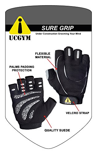 -. Binding : Misc. -. Brand : UCgym -. Feature : ADJUSTABLE VELCRO STRAP - You can tighten them as much as you like / PADDED PALM AND FINGERS PROTECTION - Adds comfort during weigh lifting and keeps your hands looking nice / SILICON PALM - for better grip / MADE OUT OF QUOLITY MICRO SUEDE AND PREMIUM FLEXIBLE MATERIALS -. IsAutographed : 0 -. IsMemorabilia : 0 -. Label : UCgym inc. -. Manufacturer : UCgym inc. -. ProductGroup : Sports -. ProductTypeName : SPORTING_GOODS -. Publisher : UCgym inc. -. Studio : UCgym inc. -. Title : UCgym Sure Grip WORKOUT GLOVES - Great for Gym, Weight Lifting, Crossfit, Cycling