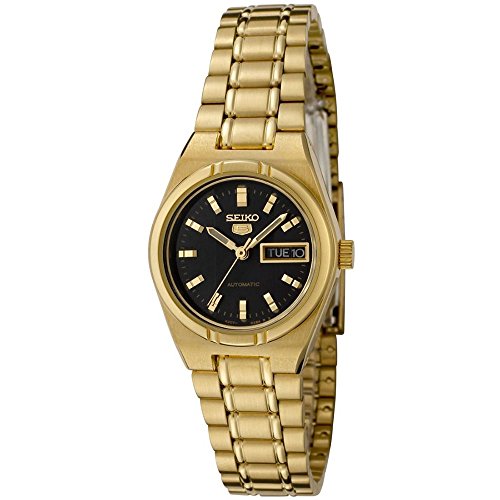 Seiko brings us this 5 Automatic watch that emits elegance and class Besides its stylish gold stainless-steel band and chic 23MM stainless steel case this watch has security features such as the 30 meters 100 feet 3 atm water resistance and hardlex crystal that are sure to help protect it The black dial ties everything together and looks wonderfulFeature