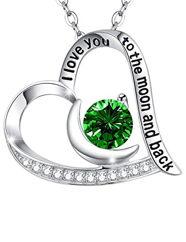 superior quality, 18K white gold plated over sterling silver, this delicate Emerald May Birthstone Love Heart Moon pendant Necklace and 20" rolo chain will never let you down.