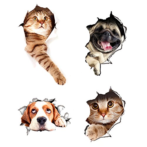 3D Cats Wall Decals Removable Toilet Lid Stickers Hole View Vivid Dogs Decals Art Sticker for Bathroom /Kids Room/ Refrigerator Decoration 4pcs(3D)