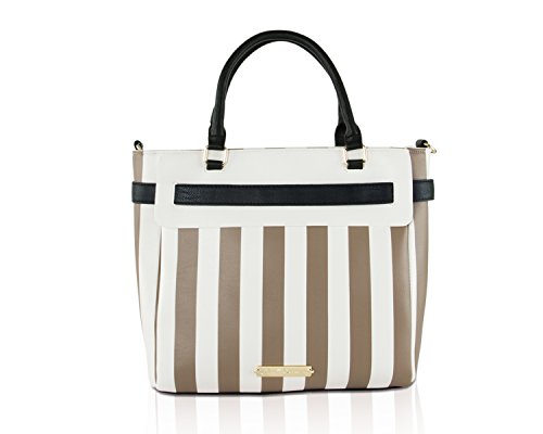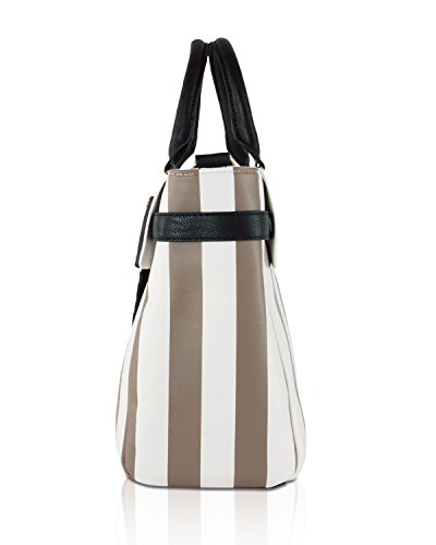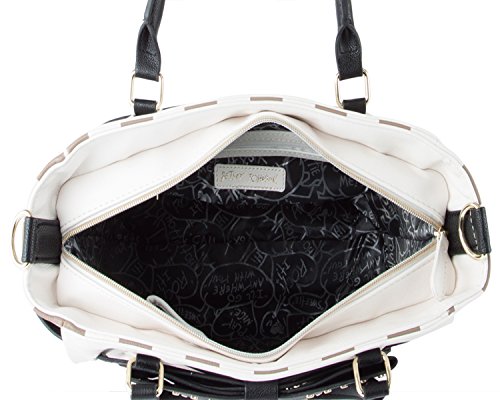 Carry everything you need in style this with this Belted Bow Tote from Betsey Johnson. Made of PVC faux leather, Purse features Exterior Striped Allover Print, with signature belted bow, Making it fun and flirty. Gold color hardware, Dual top rolled handles 5" drop, Top zip closure opens to fully lined interior with 2 wall slip pockets and 1 wall zipper pocket, It Brightens up your outfit with a pop of personality.Feature