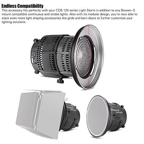 Features: --Shape your Light a. A Multi-Functional Light Shaping Tool; b. Dial-in Brightness. Focus the intensity of your light from 14000lux to a sun-like intensity of 67000lux at 0.5m; c. Spot and Flood Light. Capable of a Variable Beam Angle from 12-42 degrees of light; d. Perfect for Macro and High-Speed Photography. --Endless Compatibility a. Modular Design: Front Back Mounts allow for Stackable Light Shaping Accessories like Grids and Barn Doors(7"); b. Universal Mount: Perfect not only for the Aputure Light Storm COB120 Series, but also any Bowens Mount Light. --Rock-Solid Industrial Design a. Tempered Glass: Formed with a High-Grade Silicon for Long-Lasting Durability; b. Fiberglass Shell: Both Durable and Effective for Heat-Dissipation.