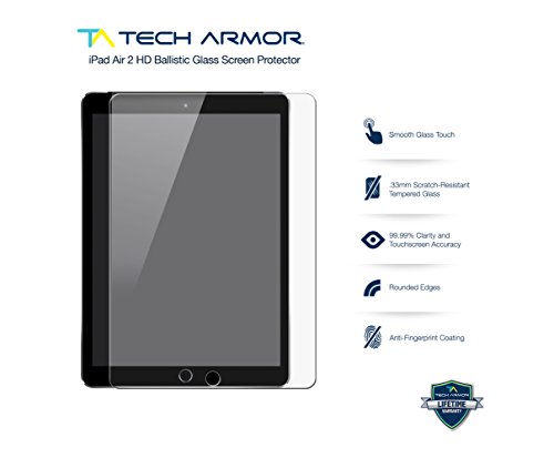 - Feature : Compatible Model(s): iPad Air 2 / iPad Air (first generation) by Apple / Amazing look and feel! The way your stunning iPad Air 2 / iPad Air (first generation) HD display was intended, but with maximum protection! From scratches to high impact drops, you are completely covered with Tech Armor Ballistic Glass. / Precise laser cut tempered glass made with polished, rounded edges. / 99.99% HD Clarity and Touchscreen Accuracy. / Bubble-free, easy install, and perfect fit- Guaranteed by the Tech Armor No-Hassle Lifetime Replacement Warranty.