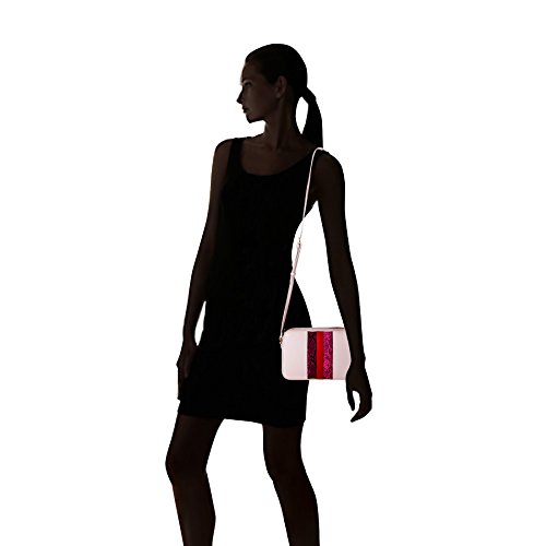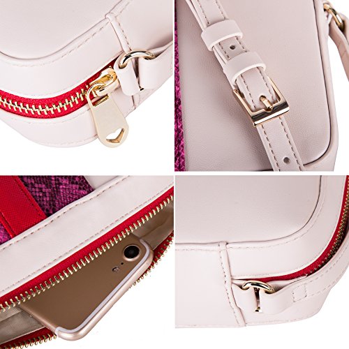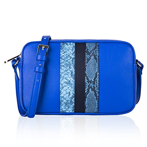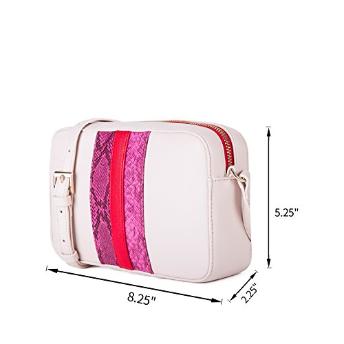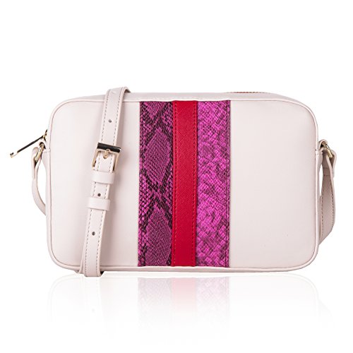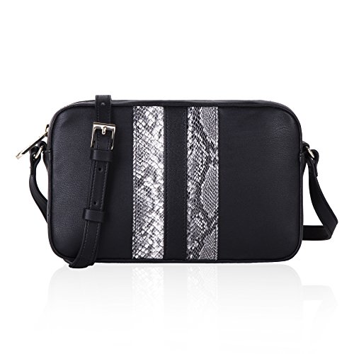 Stripes crossbody bag with top zip and adjustable cross body strap. Front of bag with contrast straps details. Centered strap in plain crosshatch with python straps on two sides. Outer parts in plain smooth PU.
