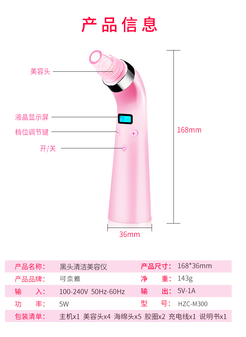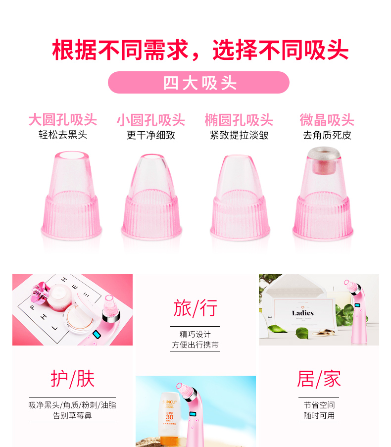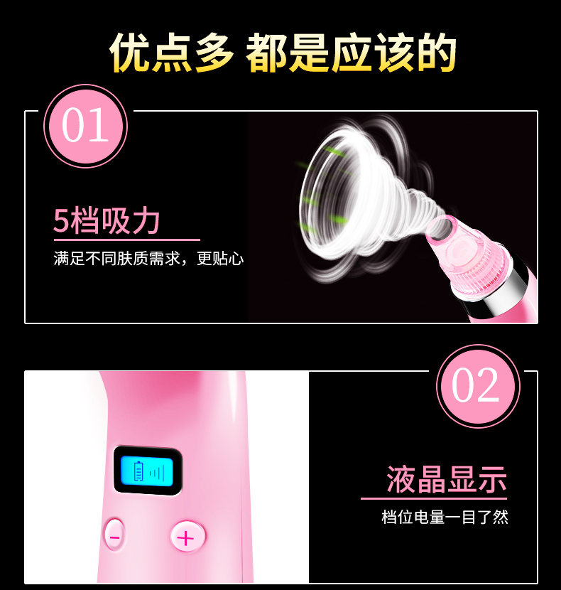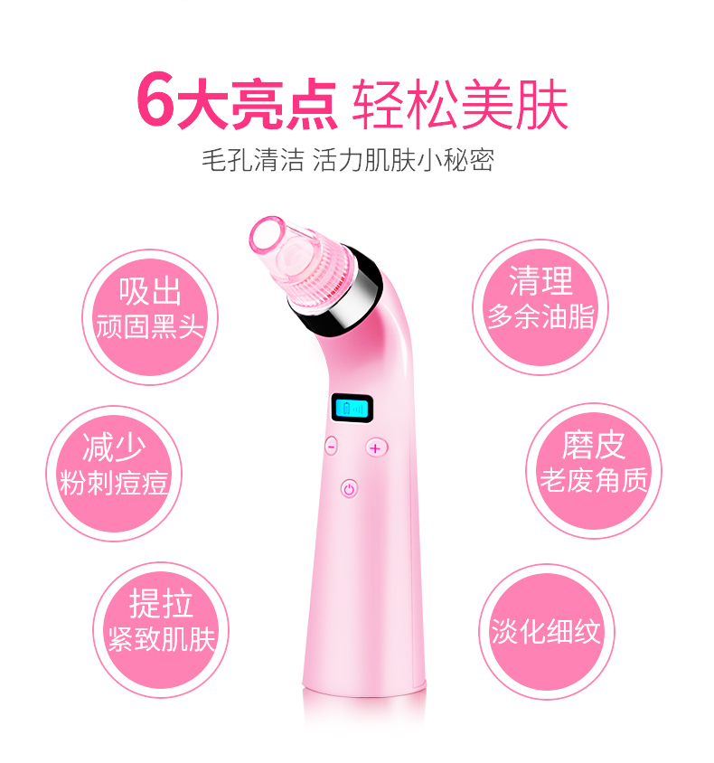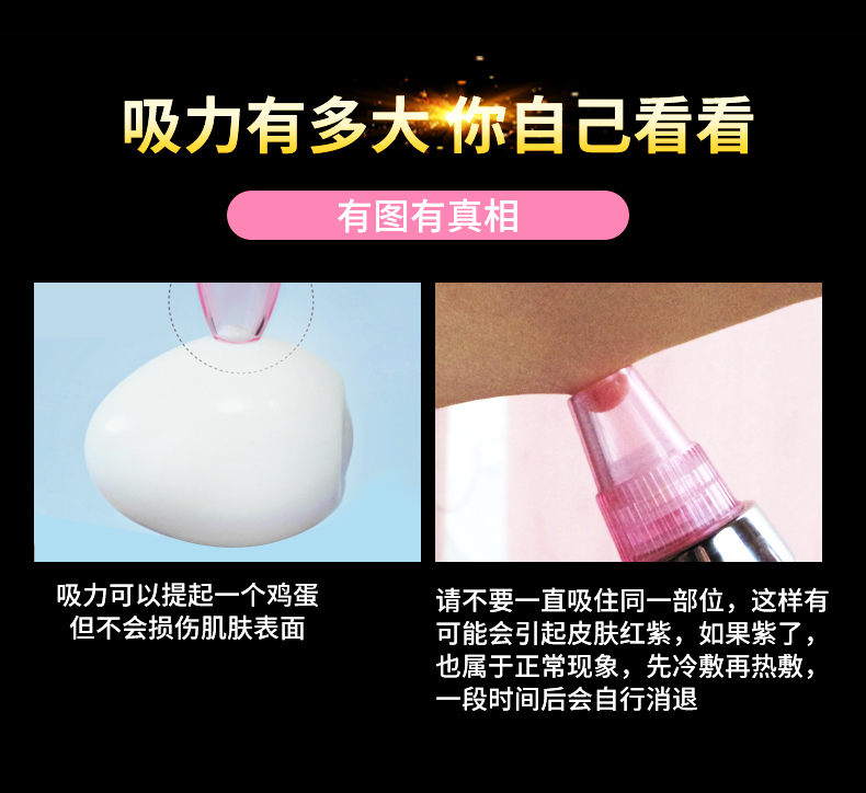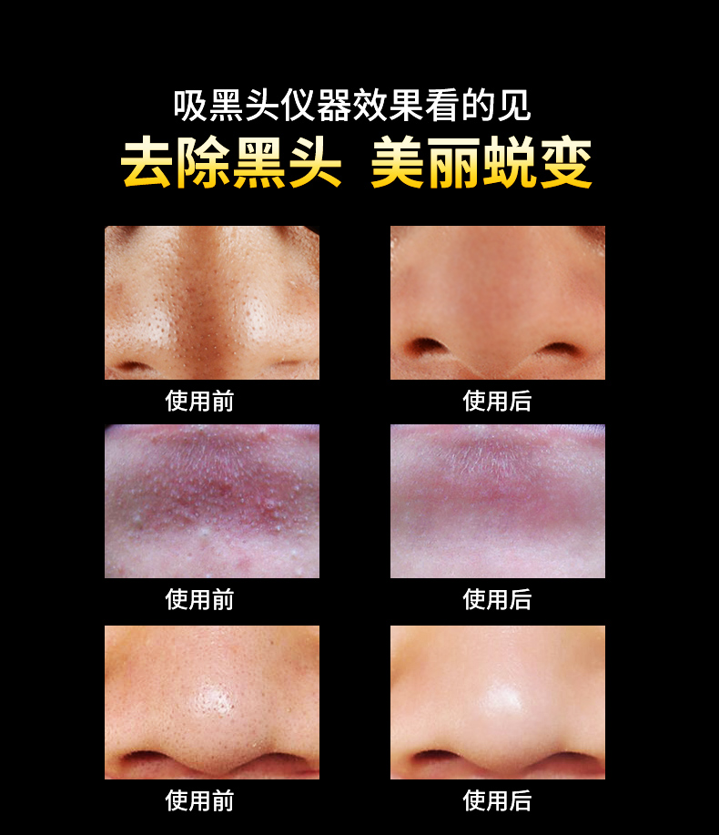 温馨提示:本产品作为一款美容仪器,在使用之前,建议先热水敷脸或者蒸脸器熏蒸,亦或者使用黑头导出液,然后配合本品使用,才能达到更好的效果。单纯使用本仪器可能一些顽固性黑头比较难以吸出,并且会导致毛孔变大或损伤皮肤。所以建议配合导出液或者蒸脸器,热水敷之后使用,效果更佳。