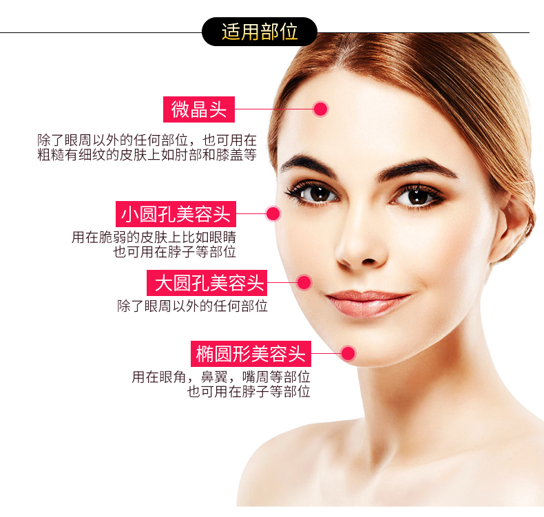 吸力棒上钻石之粗细度,来控制磨皮时的深浅度。同时配备四种不同形状的探头,拥有四种不同的功效,集磨皮,紧致,清洁毛孔等功能于一身。