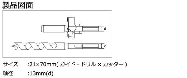 | サイズ | サイズ:21×70mm(ガイド・ドリル×カッター)、軸径:13mm(d) 個装サイズ:11×30×9cm |