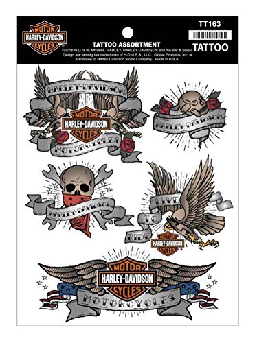 Product DescriptionHarley-Davidson® Temporary Tattoo Sheet, TT163. Classic tattoo assortment of skulls, Bar Shield, eagles and etc. 4 color process. Total of 5 tattoos. Sheet size 5' W x 7' H.0